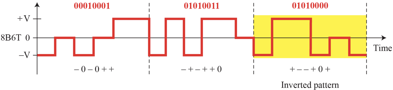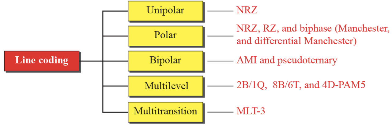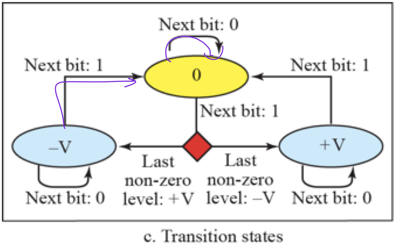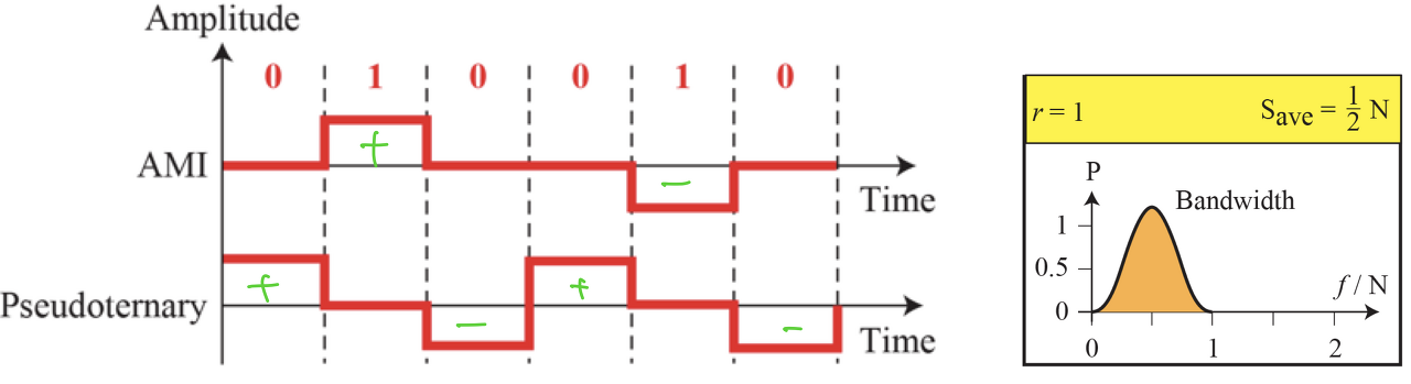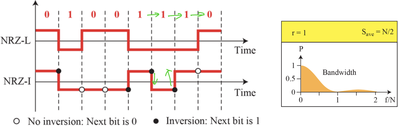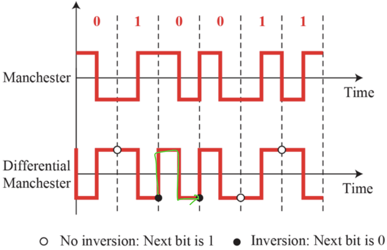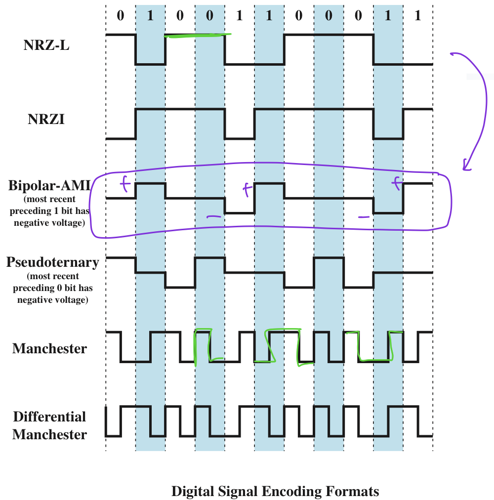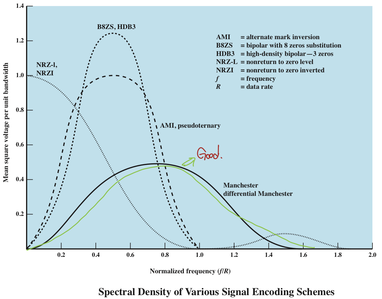 - DC: '1111...' or '0000...'와 같이 긴 구간 동일한 signal로 주파수의 변화가 없고, voltage level이 한 방향으로만 흐르는 경우 아주 낮은 주파수 성분은 지원하지 않는 통신 media에서 문제가 된다.