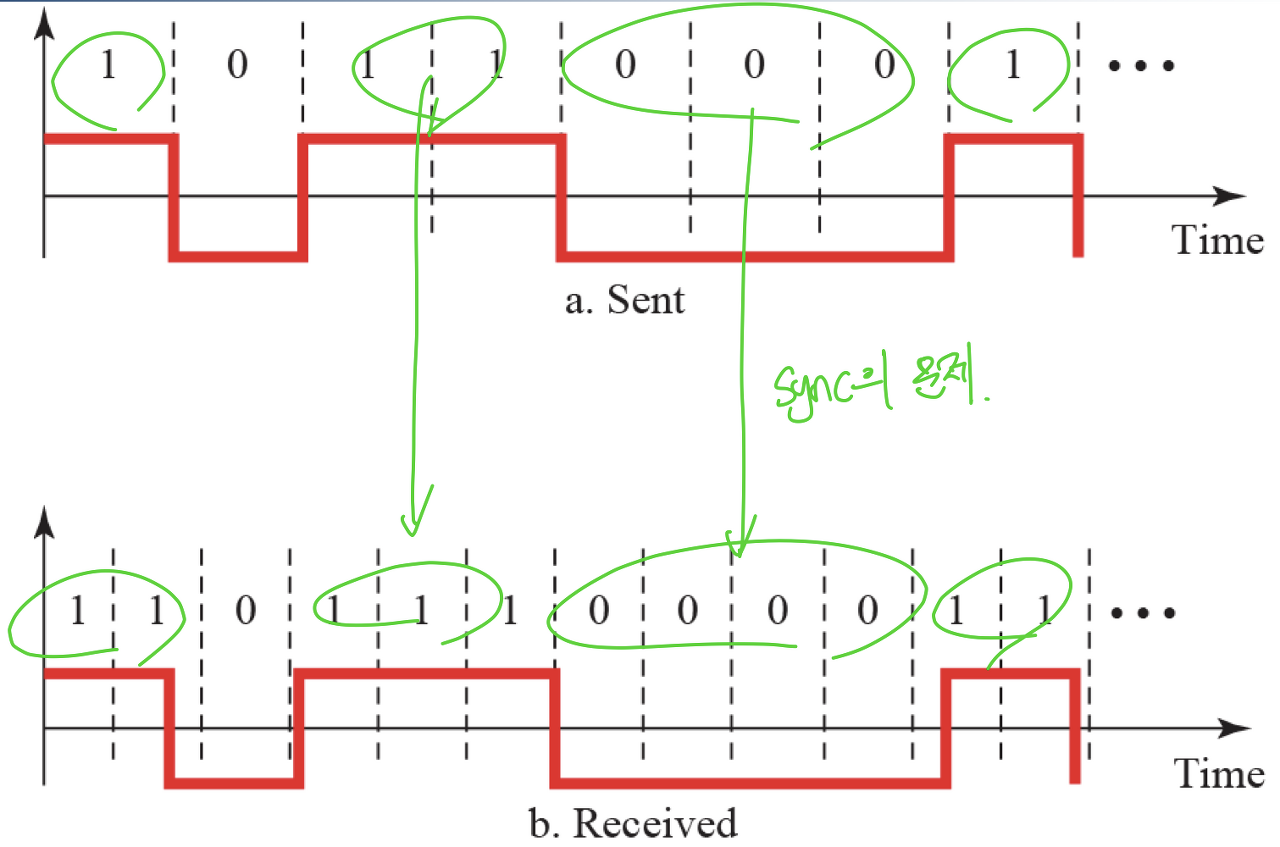 - 제일 상단의 일반적인 digital signal를 표현하는 NRZ-L을 보면, '000...' 을 길게 보내게 되면, Sync가 맞지 않아 0이 얼마나 온 지 정확하게 모를 수도 있다.