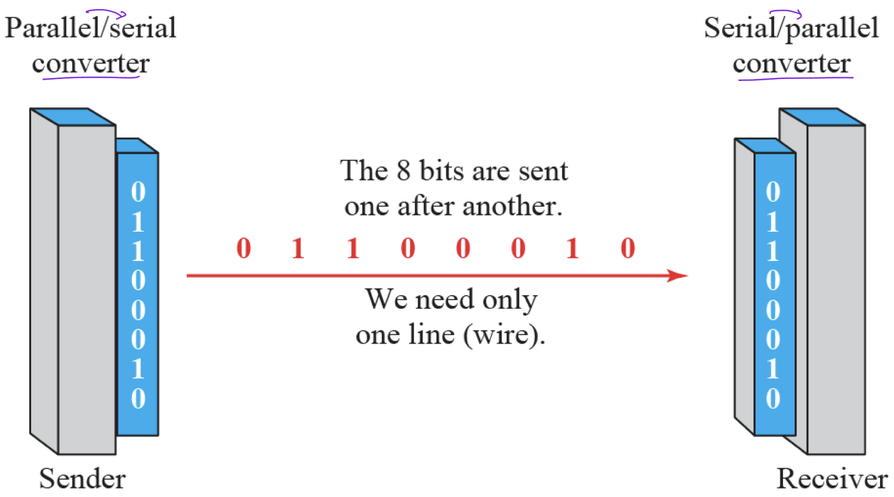 - 두 통신 devices간에 1개의 channel만 사용하여 1 bit씩 연이어 전송한다.