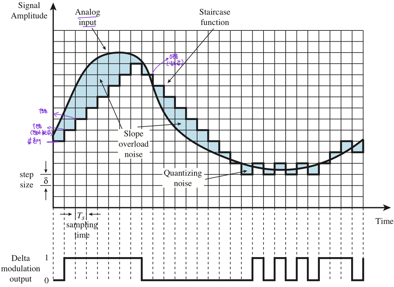 - analog signal을 일련의 구간(step size)으로 나누어 각 구간의 근사치를 택한 뒤, 원본 신호값과의 차이를 구하여 오차의 증가 또는 감소를 결정하고, 증가/감소 상태의 변화를 전송한다.