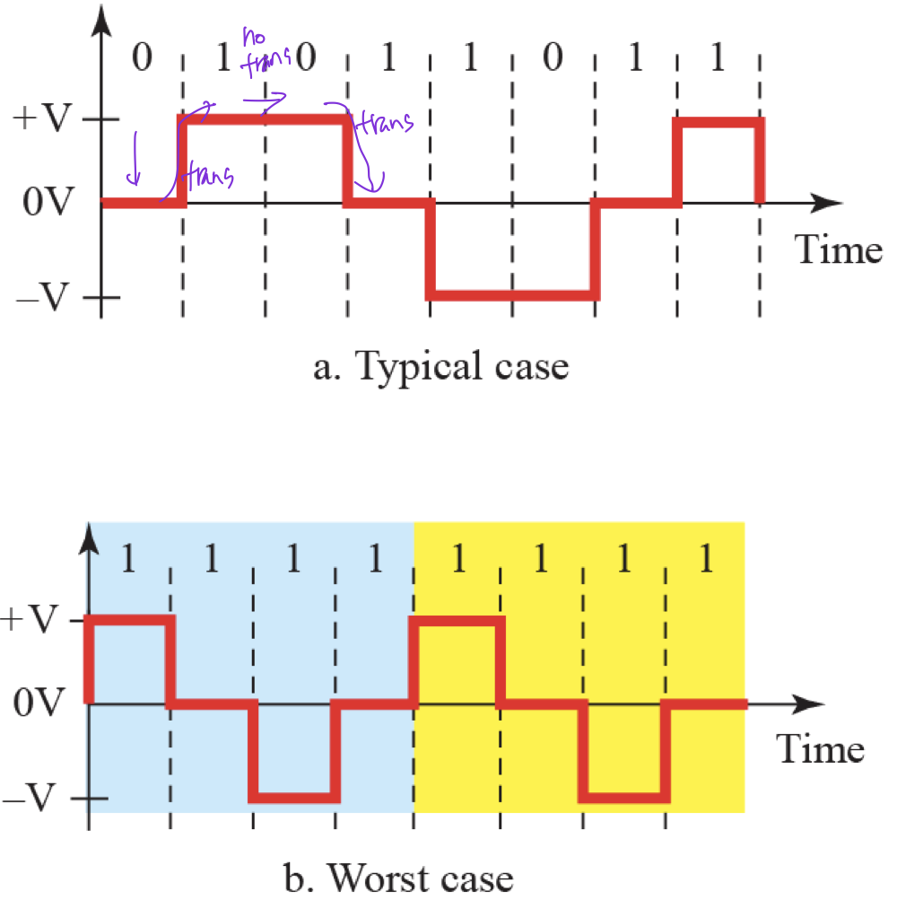 - 동기화 문제: 동일한 signal element가 길게 반복되면, receiver단에서 clock이나 다른 원인으로 signal의 정확한 구간을 나누지 못하는 문제