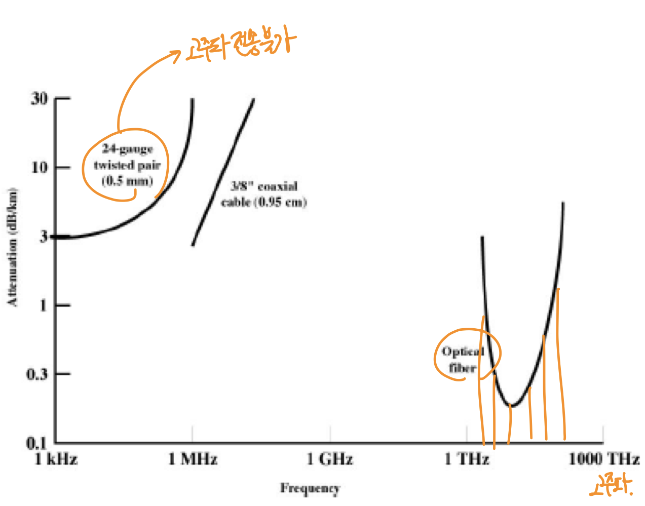- 고주파일수록, 신호 감쇄량이 크다.