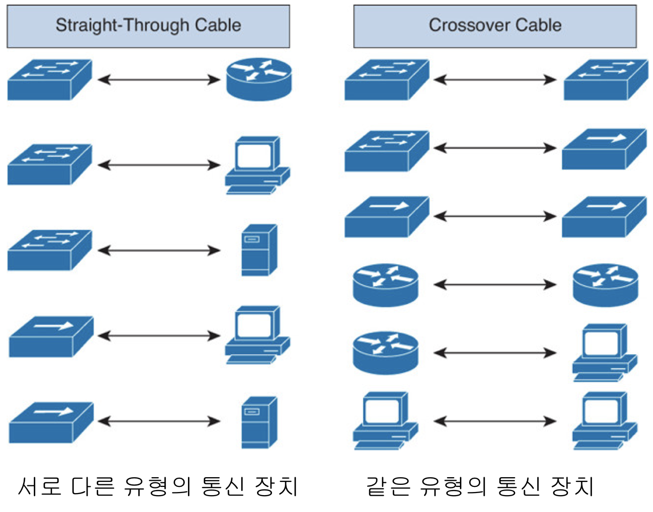 - Straight-Through는 송신용 line과 수신용 line의 역할을 가지는 line이 정해져 있다.