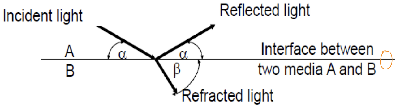 - 서로 매질이 다른 A와 B가 맞닿는 interface에서 입사각에 따라 reflection이 발생한다.