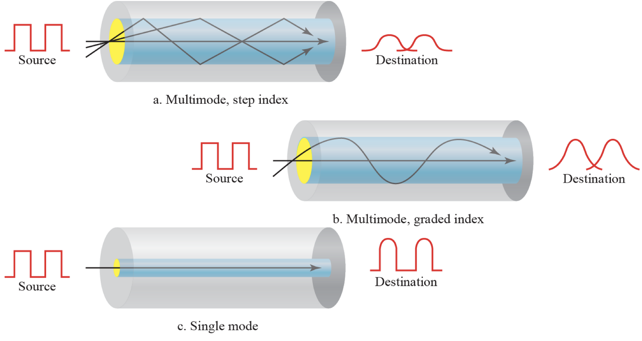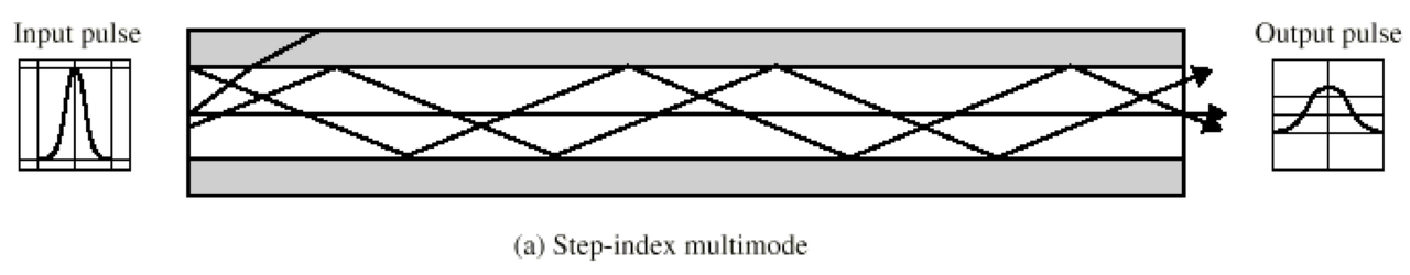 - Step-index: Core의 밀도가 일정, 여러 빛의 성분이 여러 Path로 수신측에 도달하는 것