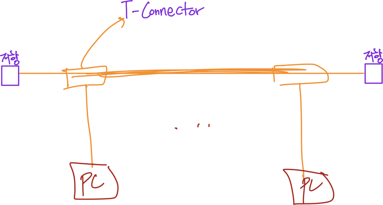 초창기 Ethernet: bus구조 (thin, thick cable로 2개 존재)