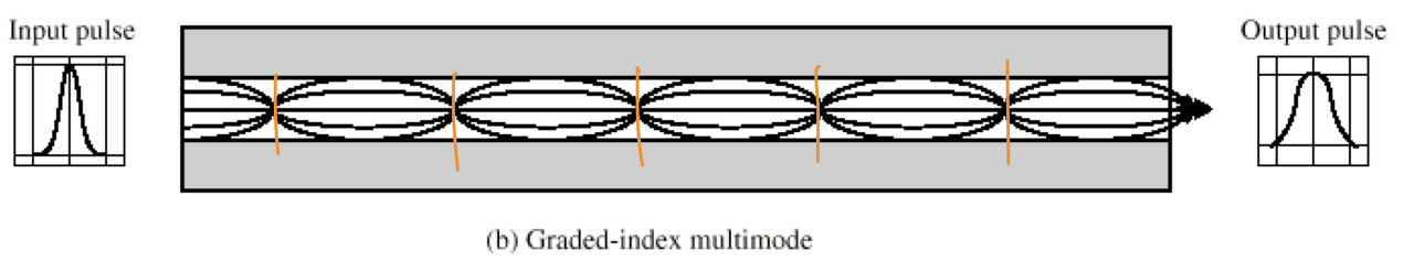 - Graded-index: 여러 빛의 성분이 여러 Path로 수신측에 도달하지만, Core에서 Cladding 방향으로 매질의 밀도가 점점 낮아진다.