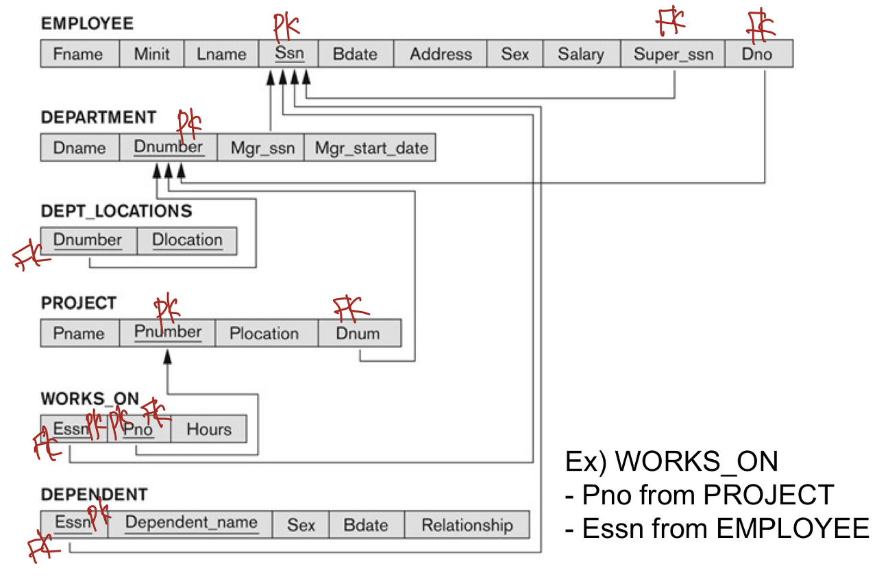 - referencing relation 에 존재하는 tuples은 FK(=foreign key attribute) attribute를 가지고, 이는 referenced relation 의 primary attribute인 PK를 참조한다.
