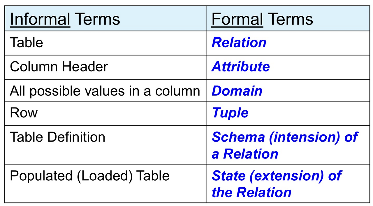: "sets"를 기반으로 한 수학적인 개념 (set: element간 중복이 없는 집합), relational model에서 database => a collection of relations