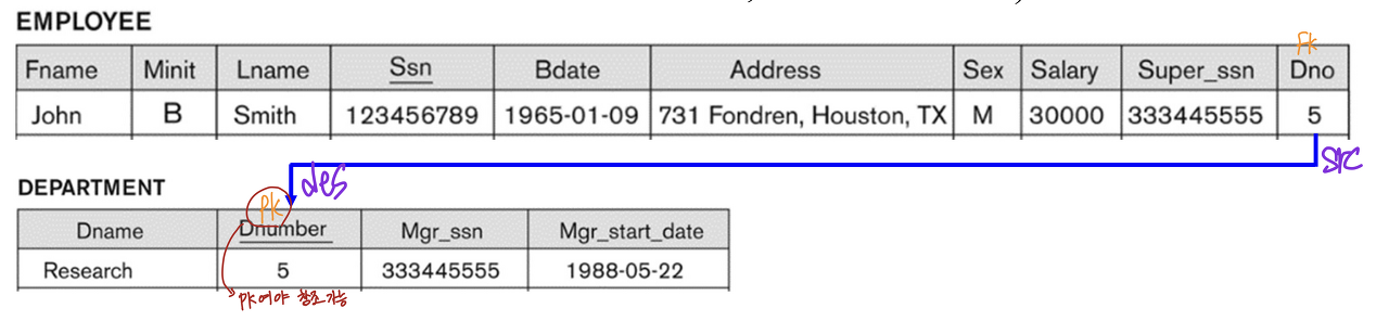 모든 EMPLOYEE tuple에 있는 Dno값은 DEPARTMENT relation에 있는 tuple들의 Dnumber값과 매치되어야 한다.