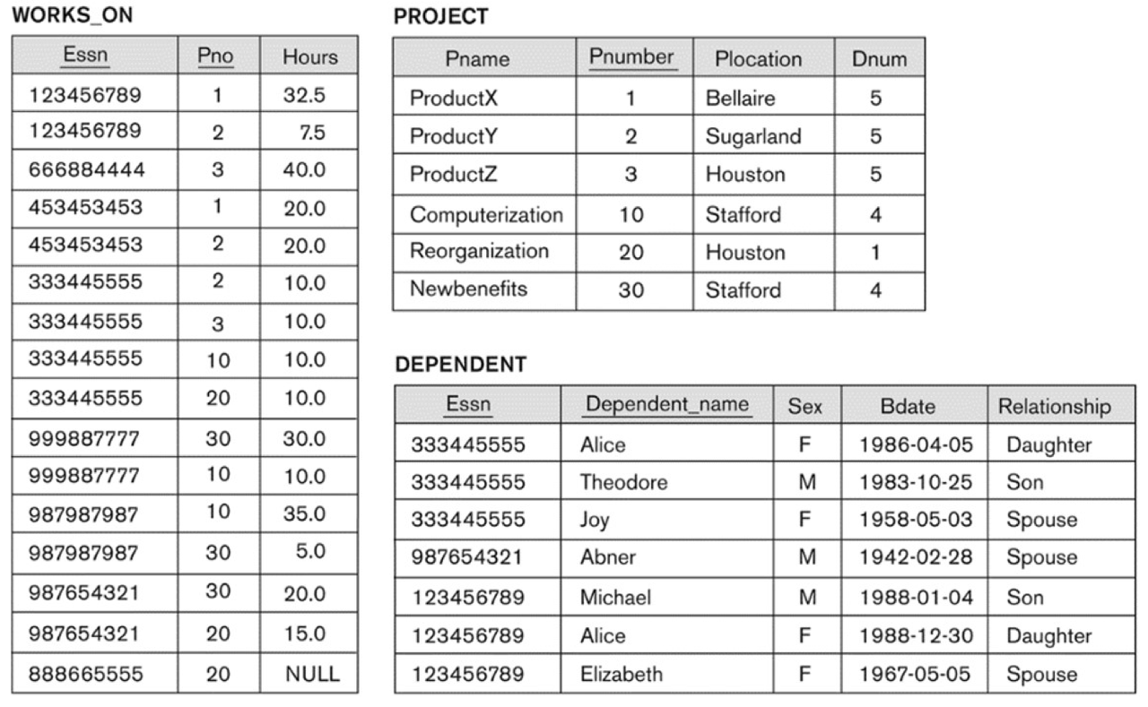- Delete the WORKS_ON tuple with Essn = ‘999887777’ and Pno = 10