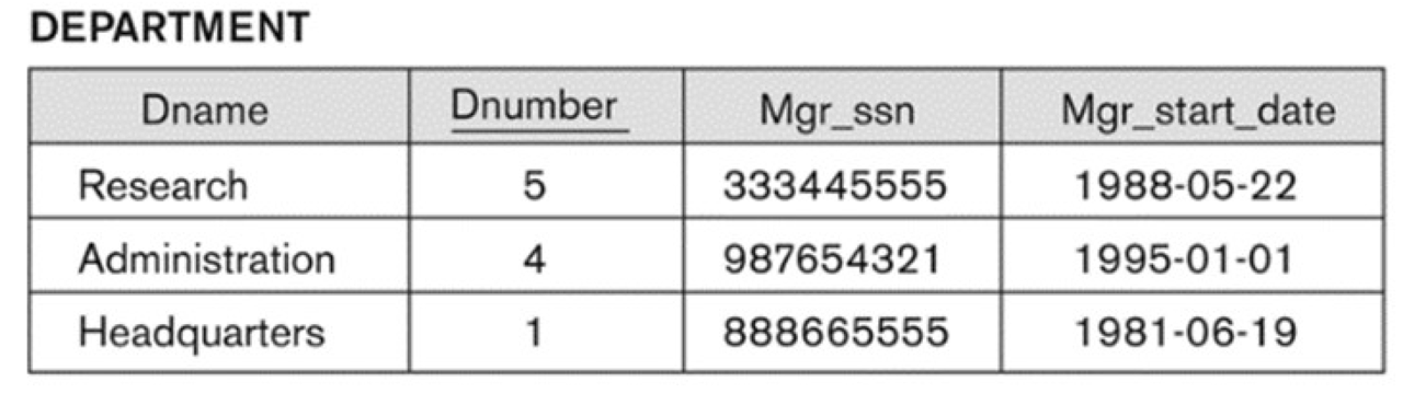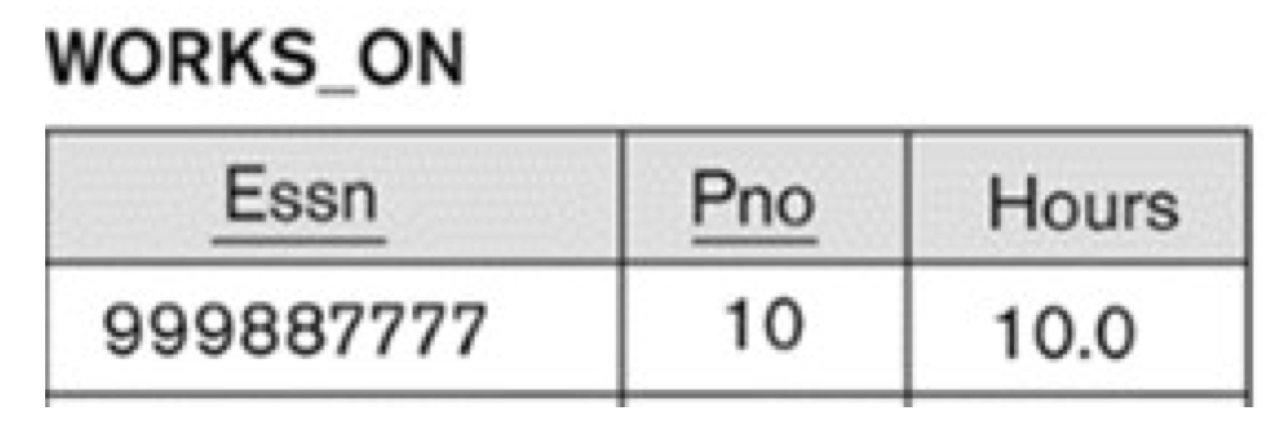 - DEPARTMENT relation에 Dnumber가 7인 tuple이 없음 -> referential integrity constraint를 위반