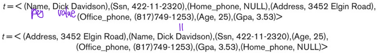 -위의 두 tuple은 identical한데, 이는 relation의 정의에 ordering이 포함되지 않기 때문이다. - 또한 이러한 tuples는 name과 value가 함께 존재하기 때문에 "self-describing"이라고 한다.