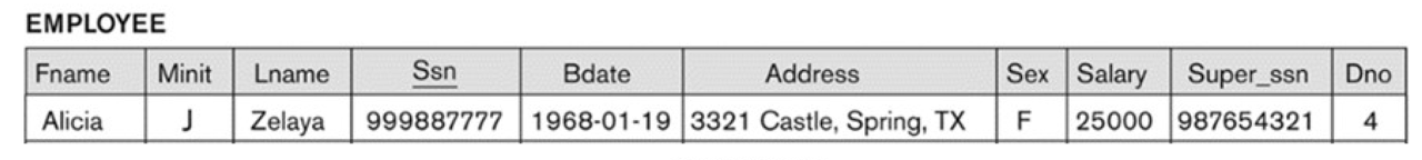 - Insert <‘Alicia’, ‘J’, ‘Zelaya’, ‘999887777’, ‘1960-04-05’, ‘6357 Windy Lane, Katy, TX’, ‘F’, 28000, ‘987654321’, 4> into EMPLOYEE