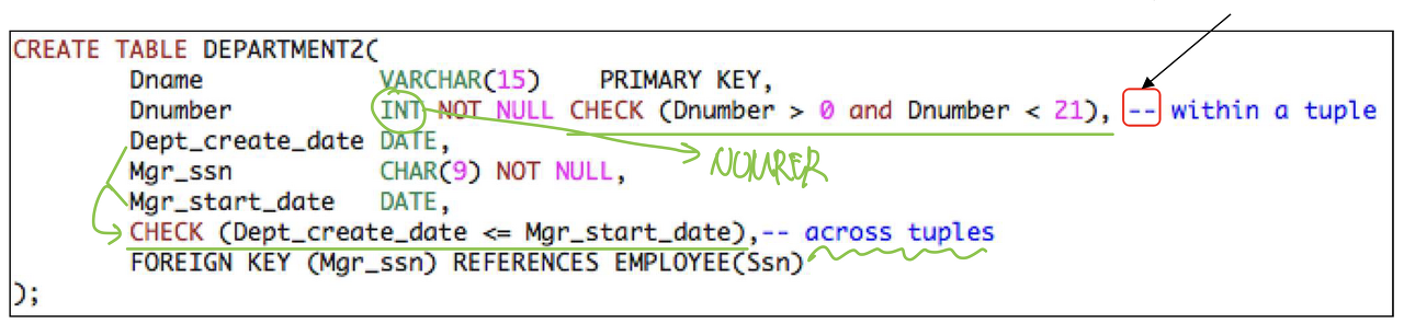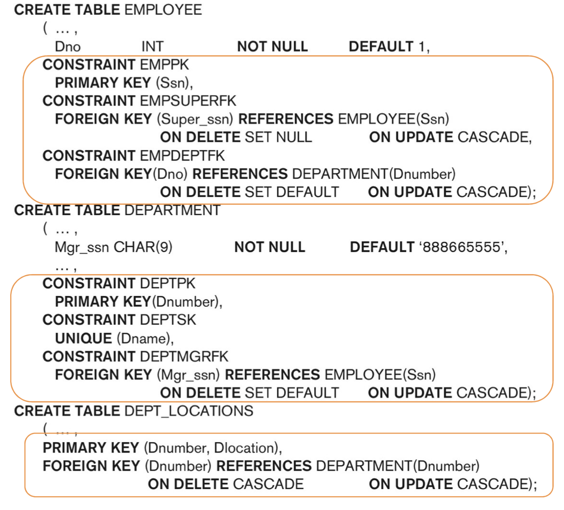 - key, entity integrity, and referential integrity constraints는 attribute declaration이후에 정의될 수 있다.