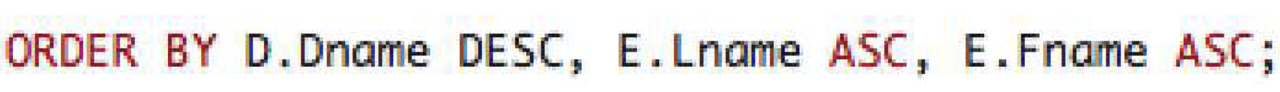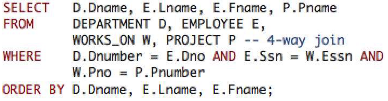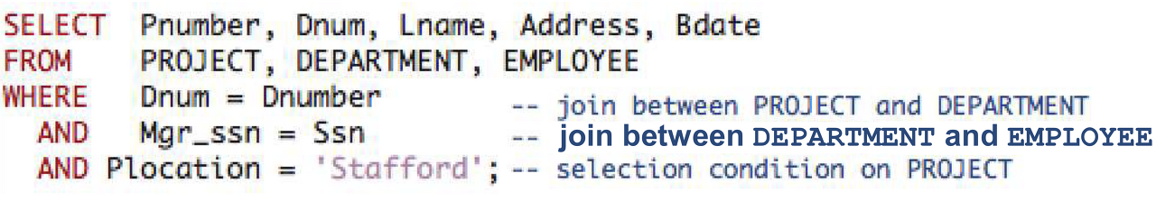 - “Make a list of all project numbers for projects that involve an employee whose last name is ‘Smith’, either as a worker or as a manager of the department that controls the project."
