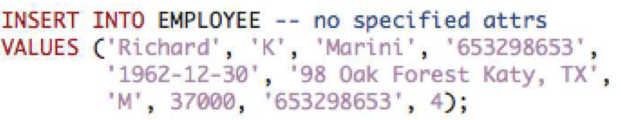 - 명시되지 않은 attributes에 대해서는 DEFAULT or NULL로 set