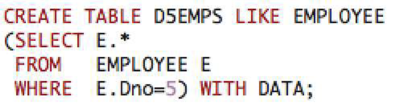 - 새로운 table(say, D5EMPS)는 이미 존재하는 table(say, EMPLOYEE)과 동일한 attributes를 가진다. 이때, LIKE & WITH DATA 를 이용해서 생성할 수 있다.
