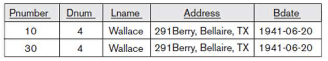 - P.Dnum = 5 -> 참조하는 다른 tuple의 attribute 값도 변경해야 함.