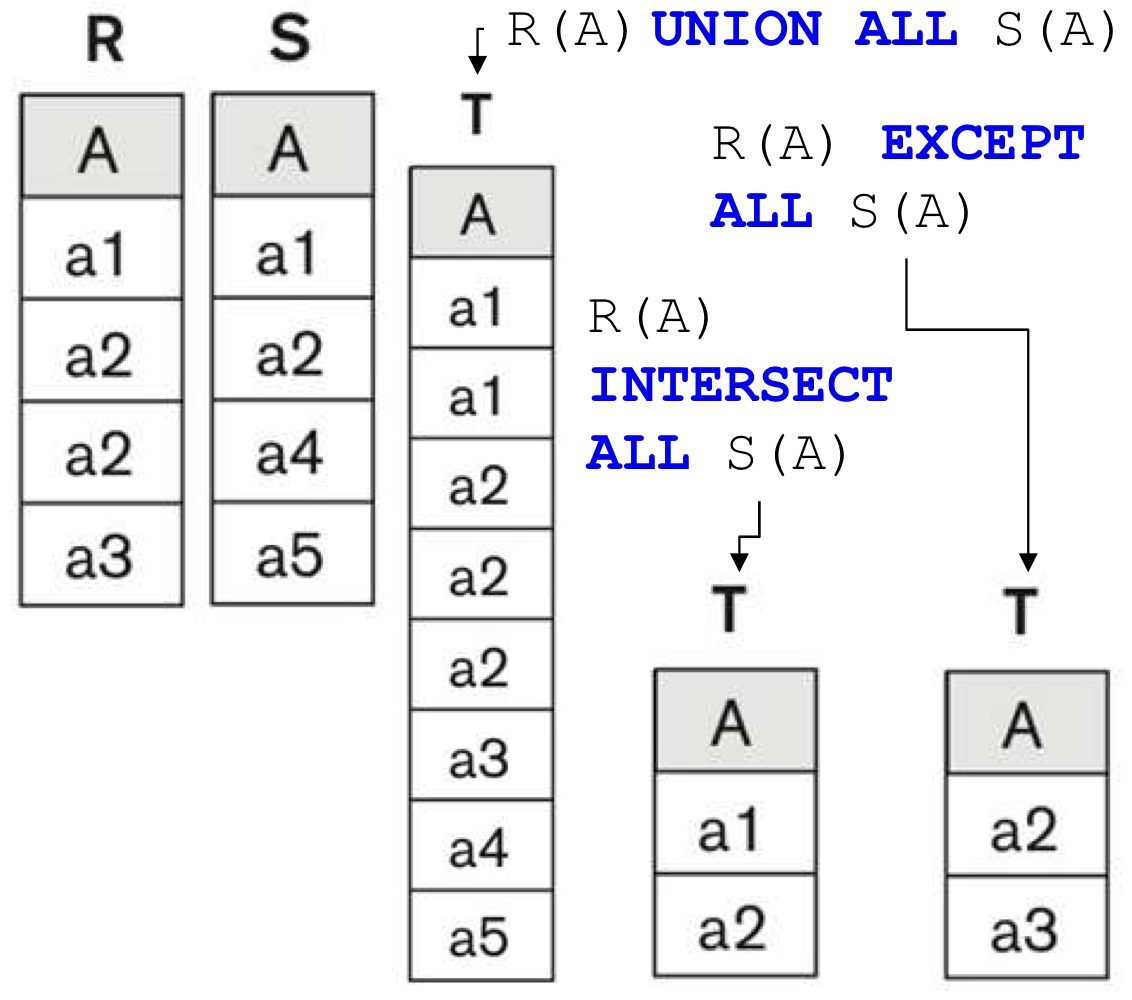 - multiset operations(중복 다중 집합): UNION ALL, EXCEPT ALL(or MINUS), and INTERSECT ALL