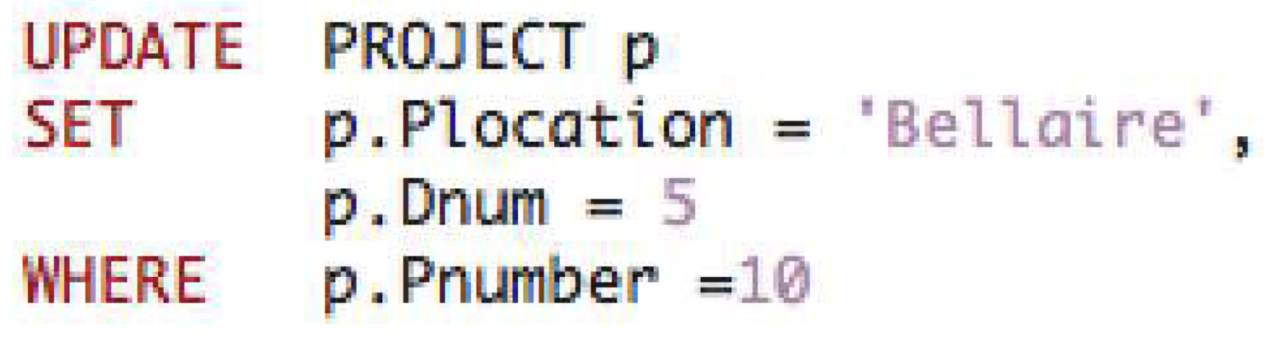 - Ex) Change the location and controlling department number of project number 10 to ‘Bellaire’ and 5, respectively.